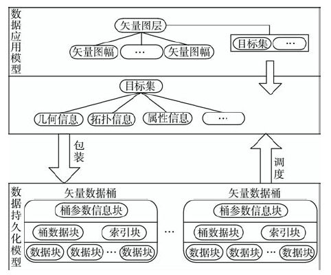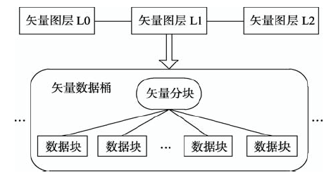 在每个数据块中,对包含的地理目标建立目标级索引,构建矢量数据的多级索引机制。数据持久化模型描述了矢量数据模型调度方式。当调度矢量数据时,根据调度条件(如空间范围)首先确定当前调度的矢量数据所在的所有矢量数据桶,进而获取相应的桶数据块和索引块,根据桶数据块和索引块快速获取该桶里符合条件的矢量数据标识;然后根据矢量数据标识,结合桶数据块,直接定位到矢量数据块,实现高并发下矢量数据的高效访问。