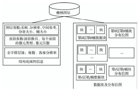 如图4所示,结构化的属性信息包括图层参数、波段参数和金字塔层级信息等属性数据。非结构化的数据块则包括栅格图层的基础层数据(第0层数据)数据块和金字塔图层(第1层至第j层)数据块;空间上相邻的数据块在逻辑上同属于一个数据桶,对于每一个数据桶分别有一个桶块分布位图用于描述该桶内数据块的分布。数据桶与数据块之间建立索引确定其对应关系,数据块的索引信息包括所属图层ID、波段ID、图幅版本ID、块行列号、金字塔层级等信息。