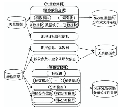 矢量数据和栅格数据采用NoSQL数据库/分布式文件系统和关系数据库相结合的存储方式,其物理存储方式如图5所示。
