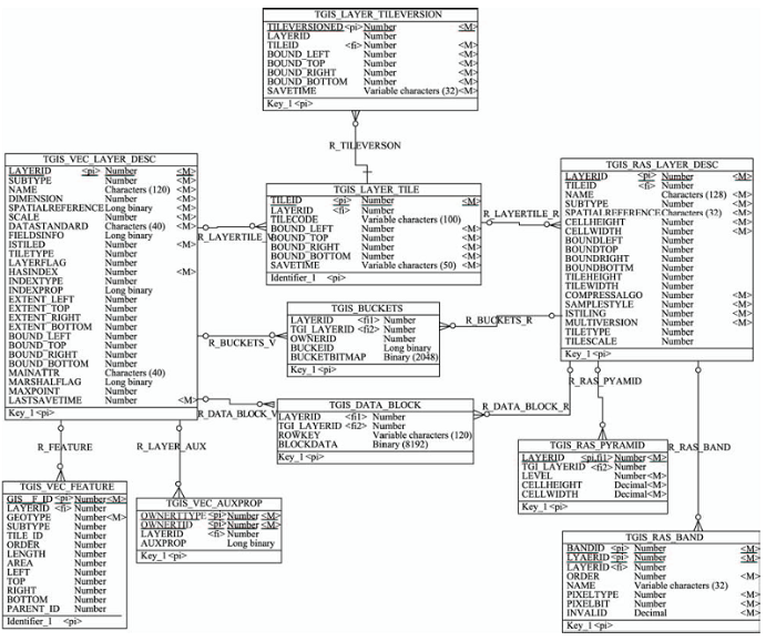 栅格图层的描述信息、图幅、图幅版本、金字塔、波段信息存储在关系型数据库中,分别对应的表为:TGIS_RAS_LAYER_DESC、TGIS_LAYER_ TILE、TIGS_LAYER_TILEVERSION、TGIS_RAS_ PYRAMID和TGIS_RAS_BAND表。