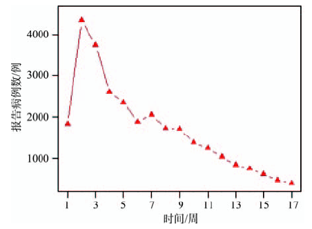 本文选用2008年5月1日至8月27日,共计17周的山东省手足口病发病报告数据。通过统计分析,得到报告病例数周统计图(图1)。由图1可看出,山东省手足口病报告病例数主要集中在第2-8周,约占整个研究时间段病例数的65%,其中5月的第2周达到最大值,随后手足口病报告病例数开始持续下降。