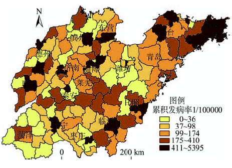 图2 山东省手足口病累积发病率分布图(2008.5-2008.8)