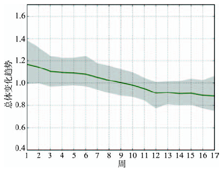 图3为2008年5月1日至8月27日共17周山东省手足口病发病风险时间变化趋势
