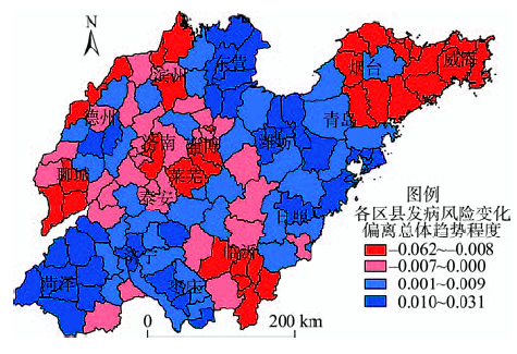 虽然山东省手足口病发病风险从5-8月有明显降低趋势,但是各区县降低速度存在很大差异。图4描述各区县手足口病相对风险变化趋势偏离整体发病风险变化趋势程度(