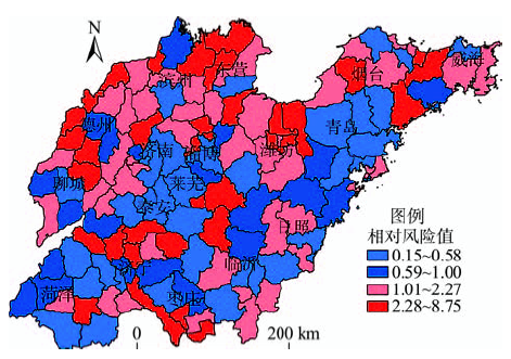 (1)利用贝叶斯时空模型估算山东省手足口病发病风险时空变化,并依据各区县手足口病发病相对风险及其后验概率值将山东省141个区县分为热点、既非热点也非冷点以及冷点3种类型,其中各区域的划分标准如下:热点区域为