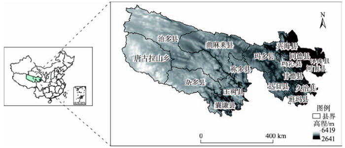 三江源是指长江、黄河、澜沧江的源头地区,位于中国青海省南部,素有“中华水塔”之称。地理位置介于北纬31°39′~36°16′、东经89°24′~102°23′之间,总面积约36.3万km2,占青海省总面积的50.3%,行政区域包括玉树、果洛、海南、黄南4个藏族自治州的16个县和格尔木市的唐古拉山乡。研究区以山原和峡谷地貌为主,海拔4000~6000 m的高山是地貌的基本骨架,西北-东南走向的巴颜喀拉山和阿尼玛卿山将三江源分为以果洛州为主体的东北部黄河源区和以玉树州为主体的西南长江、澜沧江源区,地势由东南向西北逐渐升高(图1)。三江源具有典型的高原大陆性气候,冷暖交替、干湿分明、水热同期,年平均气温为-5.6~7.8 ℃,年总降水量在262~772 mm之间。植被类型以草地为主(面积比约为68%),包括高寒草甸、高寒草原、沼泽湿地和温性草原等[14],另外还分布有针叶林、灌丛、高山植被等。土壤类型按海拔从高到低依次分布有高山寒漠土、高山草甸土、高山草原土、山地草甸土、灰褐土、栗钙土和山地森林土,沼泽化草甸土也较为发育,冻土分布广泛。