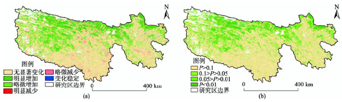 (1)2000-2013年,三江源植被NDVI整体上呈增加趋势。NDVI呈明显增加的区域面积比例达17.84%,呈明显减少的区域仅占0.78%,绝大部分地区(59.64%)的NDVI变化稳定或没有显著变化趋势。
