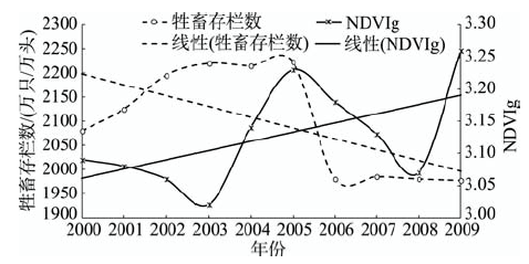 图3 2000-2009年三江源NDVIg与牲畜存栏数变化
