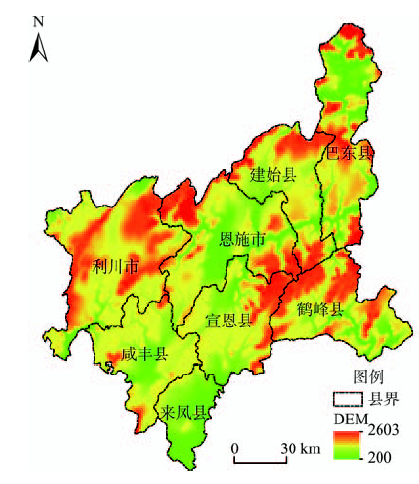 恩施州位于108°23'12″~110°38'08″E,29°07'10″~31°24'13″N,地处湖北省西南部,湘,鄂,渝3省(市)交汇处,属于中国14个连片特困地区之一的武陵山区,辖恩施,利川2市和建始,巴东,宣恩,咸丰,来凤,鹤峰6县(图1).恩施州属亚热带季风湿润气候,四季分明,因峰高谷深,气候具明显的垂直分带性,夏天在海拔800 m以下的低山谷地,气候炎热,气温可达30~40 ℃.年降雨量1080~1504 mm,雨季多集中于7,8月,常伴有山洪暴发,灾害性气 候时有发生.地势西高东低,属鄂西褶皱山地,平均海拔高程1000 m以上,山峰耸立,河谷深切,相 对高差一般在500~1300 m之间.地层岩性较齐全,分布最广的为寒武纪,其次为三叠系下统的 碳酸盐岩地层,志留纪与奥陶纪.碳酸盐岩类(石灰岩,白云岩)面积占总面积的54.4%,裸露的碳 酸盐岩受温暖多雨气候的影响,岩溶地貌发育, 石芽,溶洞,漏斗,育谷,伏流比比皆是.因山高坡陡,山势险峻,河谷深切,新构造运动活动频繁, 降雨丰沛等因素,该区地质灾害发生种类多,分布广,频率高,灾情重,是湖北省地质灾害多发区 之一.