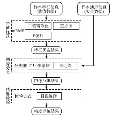 以样本特征信息以及样本地理信息为基础,将实验分为3部分,即特征优选、图像分类以及精度检验,实验流程图如图2所示。