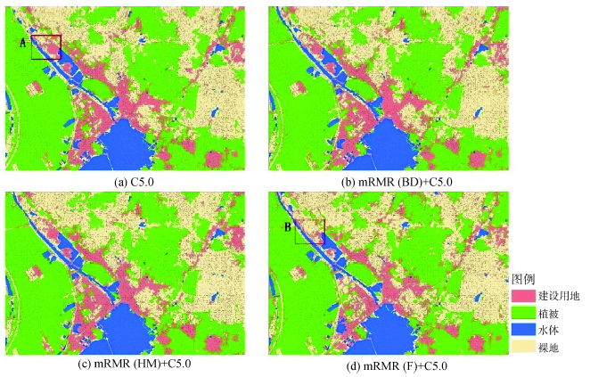 由图4、5可发现,利用每种分类器进行4组对比实验的分类结果大体相近,参照图3的研究区影像图,分类效果图中地物类型的划分也较为清晰,这表明利用相同分类器基于mRMR特征优选结果进行分类,对分类结果影响不大,从而体现出优选过程的合理性。仔细观察分类结果还可发现,不同实验结果在部分区域也会有一定差别。例如,图4中的A、B区域表示同一区域利用不同方法得到的分类结果,可以看出二者在对建设用地及裸地地物的分类上存在明显差异,这表明特征优选也会在一定程度上影响分类器的分类结果。