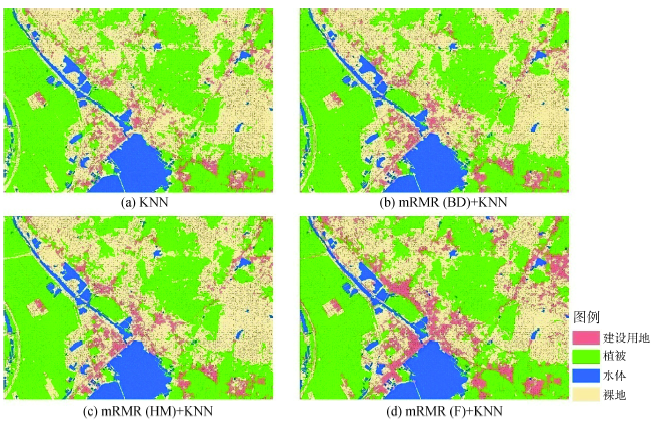 从分类精度对表4进行分析。3种方法组合均可以提高分类器的分类精度,其中KNN+BD方法拥有最高的分类精度,其在总分类精度及Kappa系数上相比于KNN方法可分别提高4.34%、7.90%。与表3实验结果类似,表4中不同实验方法的总分类精度及Kappa系数同样呈正相关,这表明了精度检验结果的可靠性。在4组实验的比较中,3组经过特征优选过程的分类结果精度均比利用KNN基于全部特征进行分类精度高,这表明对于KNN分类器而言,全部27个特征中存在一些冗余特征,从而影响分类器分类精度。KNN分类器在进行分类时需计算样本间的欧式距离,但在计算过程中并没有对参与计算的特征的重要性进行区别;而且不同特征数据单位、类型均可能不相同,虽然在计算中可以通过归一化的方式对数据进行预处理,也可通过设置权重的方式体现出不同特征的重要性差异,但如何量化权重大小也需进一步研究。所以,利用mRMR特征优选剔除在分类过程中易造成误差的冗余特征数据,会有效提高KNN分类器的分类 精度。