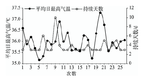 高温热浪强度包括日最高气温和持续天数2个方面。图3为厦门26次高温热浪的强度变化特征。可以看出:高温热浪的平均日最高气温在36 ℃左右上下波动,其中第20次事件发生于2005年8月,平均日最高气温值最大,为37.3 ℃;而高温热浪平均持续天数为3.8 d,第9次发生于1979年7月,持续时间最长,为10 d。
