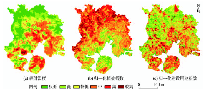 结合厦门市高温热浪案例库、天气状况和可获得卫星影像质量,选取发生于2010年7月3日至6日的一次高温热浪事件为例,使用HJ-1B星2010年7月5日的遥感影像为数据源,进行几何精校正、辐射定标等预处理之后,通过波段运算得到辐射温度、归一化植被指数和归一化建设用地指数3个环境 因子。