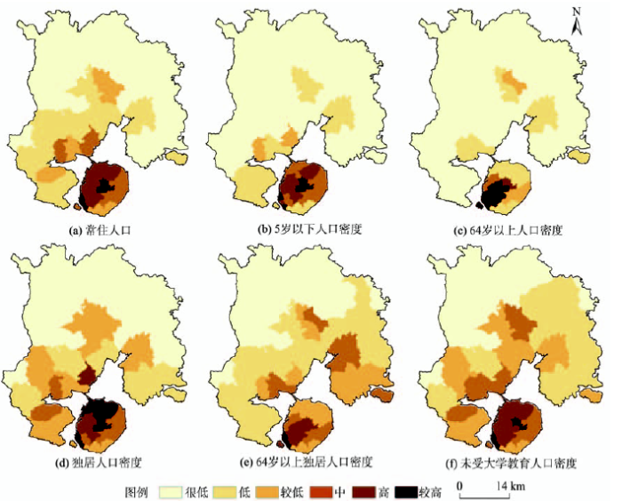 人口密度越高,风险发生的概率就越大。另外,不同特征的人群,受高温热浪影响程度不同。如老年人、儿童、独居以及受教育程度较低的人口更易受到伤害[10,12,21]。为此,本文选择常住人口密度、5岁以下人口密度、64岁以上人口密度、独居人口密度、64岁以上独居人口密度以及未受大学教育人口密度,综合反应人群的空间分布。