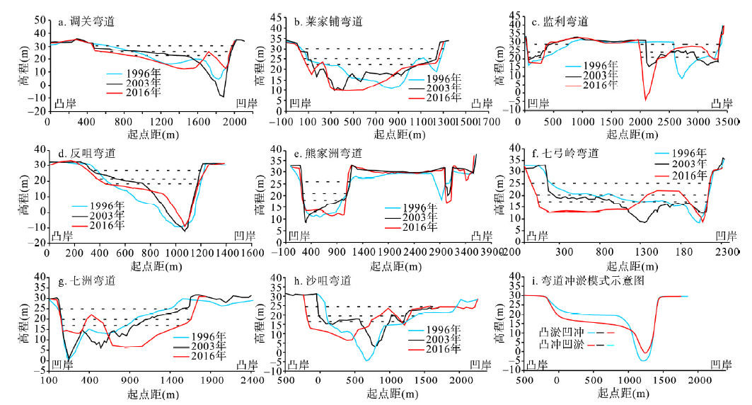 三峡水库蓄水以来,年输沙量持续减少,造成荆江河段平滩河槽、基本河槽、枯水河槽累积性冲刷的现象[24]。但横向冲淤部位的变化则是由多种因素所决定,尤其对于弯曲河段而言,三峡水库蓄水后凹、凸岸冲淤规律是本文关注的重点。图2绘制了各弯曲段弯顶部分横断面年际变化图(断面位置见图1),并给出了凸淤凹冲与凸冲凹淤模式的示意图(图2i)。