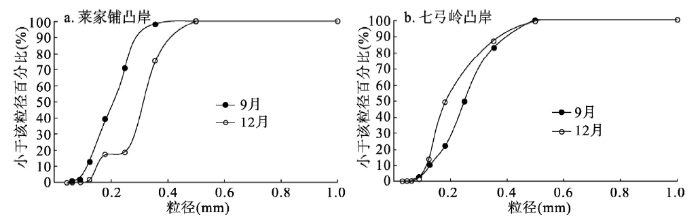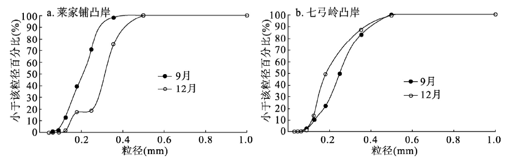 由此可以推断,沙市—监利站之间的莱家铺弯道造床泥沙未恢复蓄水前水平,而监利站下游的七弓岭弯道造床泥沙已恢复蓄水前水平。对比两弯道段凸岸床沙组成的变化情况可以发现(图8):莱家铺弯道,在2009年退水过程中(9-12月),凸岸存在床沙粗化的现象(图8a),说明退水过程凸岸仍在冲刷。而对于七弓岭弯道,在2010年退水过程中,凸岸床沙组成有细化趋势,床沙中值粒径略有减小(图8b),说明退水过程七弓岭弯道凸岸略有淤积。