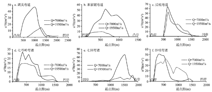 式中:k、m分别为根据当地条件决定的经验系数;ω为泥沙沉速;u为测点垂向平均流速;h为测点水深,决定固定测点各粒径组泥沙水流挟沙力的主要影响因素应为u3/h,u3/h的比值,比值越大,水流冲刷动力越强。通过图4可以看出,当流量由7000 m³/s增大至19500 m³/s时,各弯道凸岸均表现出了挟沙力增大的迹象,且挟沙力峰值区域向凸岸摆动。这一现象进一步证明,当流量逐渐增大至平滩流量过程中,凸岸水流冲刷动力增强。