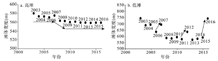以莱家铺边滩为例,由于其上游存在调关节点,上游河势较为稳定,受到边界条件、上游河势的影响较小。从滩体宽度变化来看,高滩在2003年以后基本维持不变(图6a),这与35000 m³/s以上洪水流量出现频率的锐减是一致的,三峡水库调蓄影响下,大洪水持续天数锐减至年均1天,因此莱家铺弯道高滩以上基本维持稳定,宽度变幅不超过20 m。而低滩宽度在三峡水库蓄水后则存在明显萎缩趋势(图6b),但在2006-2007年、2011-2012年和2015-2016年仍存在较为明显的淤长,这与2006年、2011年以及2015年平滩流量级持续时间的减少具有同步性(2006年5天,2011年17天,2015年15天),综合来看,平滩流量级的持续时间影响了弯曲河段凸岸冲淤规律的变化,统计结果显示(表3),当平滩流量持续时间低于20天时,凸岸一般表现为淤长,超过20天时,凸岸一般表现为冲刷。