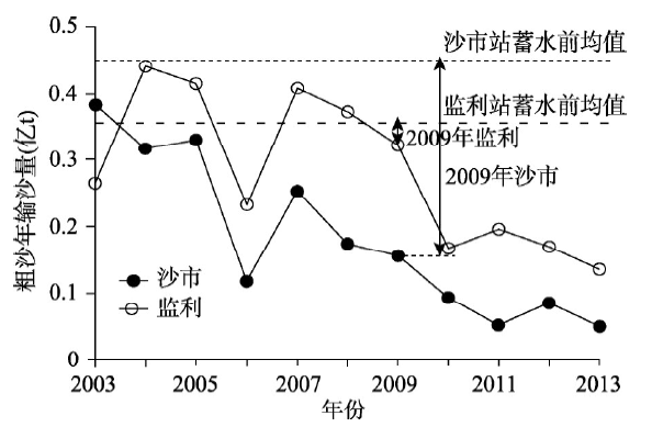图7 2003-2013年沙市和监利水文站粗沙年均输运量变化
