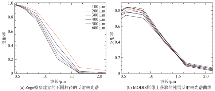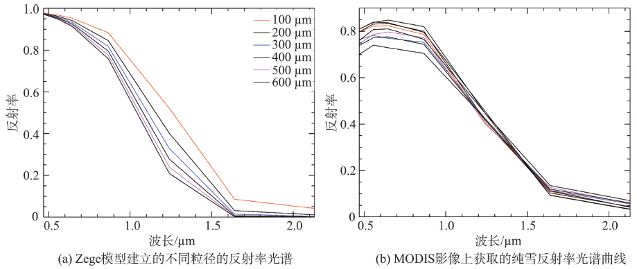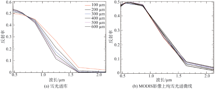 渐进辐射传输模型采用渐进的方法简化辐射传输,被广泛地应用于积雪粒径反演与反射率光谱库的建立[3-7]。由于积雪的光谱库通过辐射传输模型获取,其与MODIS影像获取尺度不同,导致MODIS影像上积雪反射率光谱与积雪光谱库中的光谱不匹配。为了解释这种现象的存在,采用渐进辐射传输模型中的Zege模型[5,7]建立不同粒径的积雪反射率光谱曲线(雪粒径形状参数仍然采用文中的5.8),如图2(a)所示。同时,选择数条反射率较高的MODIS影像积雪反射率光谱曲线,其中选择的依据为Zege模型反演的雪粒径和海拔高度,最终选取的结果如图2(b)所示。对比图2(a)与2(b)可知,光谱库与影像上的纯雪不匹配,如果直接用光谱库参与混合像元分解,会造成反演的积雪面积偏低。