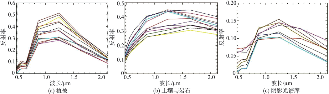 为了消除光谱库与MODIS影像的不匹配现象,本文采用L2范数进行规则化校正,L2范数被广泛应用于遥感影像的规则化[14],以消除辐射传输模型获取的光谱与影像的不匹配问题。L2范数规则化相当于压缩了数据的特征空间,但是保持了数据在特征空间的相对位置,这对均方根误差最小化指标的求取没有太大的影响,这也可以从第4节的讨论中清楚地看出。对图2的光谱进行L2规则化,其结果分别为图3(a)与3(b)。经过L2规则化后,光谱库与遥感影像不匹配程度降低。同时,对植被、土壤与岩石、阴影光谱库分别进行L2规则化,其结果如图4所示。