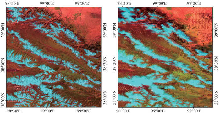 遥感影像采用中等分辨率成像光谱仪(MODIS)表面反射率产品MOD09GA,此产品已经过严格的大气校正、几何校正和辐射校正,空间分辨率为500 m,包含1-7个波段(波长分别为620~670、841~876、459~479、545~565、1230~1250、1628~1652、2105~2155 nm)。为了验证反演的积雪面积,下载了同一天的TM影像,日期为2007年9月14日。将MODIS影像进行预处理,HDF格式的影像转换成ENVI标准格式,重新投影MOD09GA产品,使其与TM影像坐标一致。波段合并且按照波长升序排列各个波段,同时裁剪出研究区域。预处理后的TM与MODIS影像如图1所示。