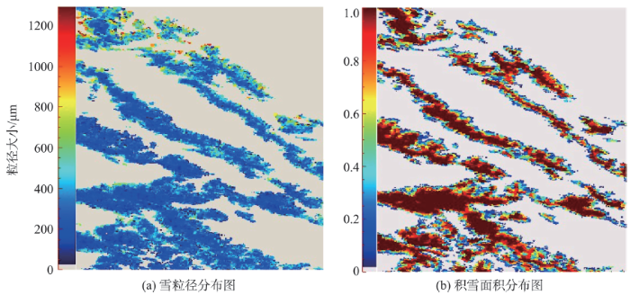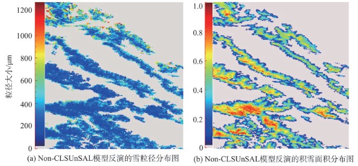 由于CLSUnSAL模型以Zege雪粒径反演结果作为先验知识,然后动态地建立不同粒径的反射率光谱库,于是Zege雪粒径反演必须事先进行,图5为Zege模型单波段(1.235 μm)雪粒径反演的结果。在MODSCAG模型中,使用MIE散射建立雪粒径光谱库(如1~1100 μm,步长10),在没有任何先验知识的情况下,如果使用这么大的光谱库进行迭代,计算时间可能会比较长,为了减小计算复杂程度,使用Zege模型反演雪粒径(其被标识为Zegesnowgrain),使其作为先验知识。2个雪粒径区间被使用,它们分别是(Minsnowgrain, Zegesnowgrain, numbers1)和(Zegesnowgrain, Zegesnowgrain + constant2, numbers2),其中numbers1与numbers2分别是2个区间的雪粒径个数,Minsnowgrain是规定的最小雪粒径,constant2是一个常数。经过数次实验,最终确定Minsnowgrain被设置成80,numbers1 和 numbers2 被设置成20、15,而constant2被设置 成250。这样的参数设置既能覆盖大量的粒径范围,同时能够减小运算量。基于CLSUnSAL算法,接下来将讨论2种光谱混合分析模型,第一种方法没有考虑L2规则化,这种方法标记为Non-CLSUnSAL,另外一种方法采用L2进行规则化,这里标记为Norm-CLSUnSAL模型。
