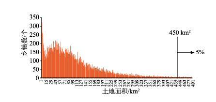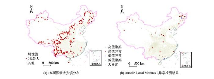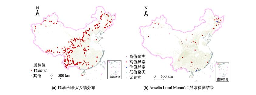 对某批次数据中29 502个乡镇的土地面积统计结果显示(图3),该数据不符合正态分布特征,因此采用极值百分比方式,选取面积最大的1%的乡镇。最大值1%乡镇和Anselin Local Moran's I异常检测结果见图4,其中1%面积最大的乡镇数为 295个,Anselin Local Moran's I检测异常乡镇数为121个。检查确认发现,1%最大的295个乡镇,有82个为错误数据,其他213个数据无问题。Anselin Local Moran's I检测异常的121个乡镇,其中3个乡镇数据无问题,其他118个乡镇数据填写错误。