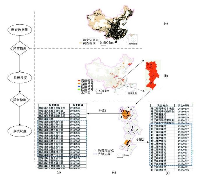 注:图(a)为全国历史山洪灾害点分布;图(b)为全国历史山洪灾害点数据县级异常检测结果;图(c)为数据异常县的乡镇级异常检测结果;图(d)为异常乡镇1的灾害点属性表;图(e)为异常乡镇2的灾害点属性表