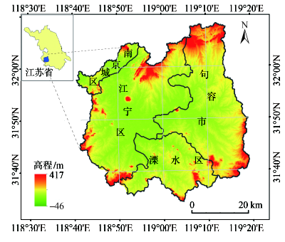 ... 秦淮河流域位于江苏省西南部,流域面积2631 km2 ,是一个闭合的流域,呈方形,长、宽各约50 km.流域范围介于118°39'~119°19' E,31°34'~32°10' N之间[23 ] .流域高程介于0~417 m之间,四面环山,中间低平.从流域四周到腹部,地貌可分为山地丘陵、黄土岗地、平原圩区,属于典型的江南低山丘陵地区.流域处于亚热带湿润季风气候区,具有气候湿润,四季分明,冬暖夏热、雨热同季、光照充足的特点.其主要的农业土地利用类型为灌溉农田、旱地.自1978年以来,秦淮河中下游地区经历了快速城市化阶段,2000年流域人口城市化水平已达59.3%,经济发展推动的城市化建设使流域的下垫面结构发生大规模变化,不透水面大幅增加[24 ] .依据城市化发展程度,对秦淮河流域行政单位进行归类,最终将流域划分为南京城区、江宁区、溧水区、镇江句容市4部分(图1 ). ...