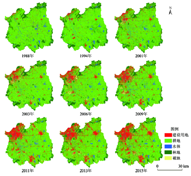 ... 将30年尺度以2001年为界分为前后2个时段,选取3个时间节点(1988、2001、2015年)进行土地利用变化轨迹分析.将土地利用分类结果栅格图根据地类进行编码,赋予每个像元相应的土地利用类别属性值,根据式(2)对3年分类结果进行基于像元的叠加计算[28 -29 ] ,得到土地利用变化的轨迹图层. ...