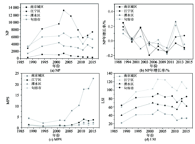 从行政区尺度来看(图3 ),南京城区2006年较2003年斑块数量大大减少,之后逐年降低,说明近10年不透水面建设不断在原有斑块上进行扩展,同时交通线路的新建,也使原有的破碎斑块不断合并成一个连通的整体;江宁区不透水面斑块数量的变化呈现一致的趋势,且变化幅度较大;溧水与句容地区不透水面斑块数量相对平稳,在近几年稍有下降。4个地区平均斑块尺寸在近30年不断增加,其中,南京城区不透水面平均斑块尺寸位居四区之首,且近30年来增长了4倍,增长迅速,江宁区次之,溧水区与句容市增长幅度相对较小。4个行政区斑块形状指数于近10年有所下降,斑块形状有简单化趋势,表明随着城市化发展的深入,城市景观逐渐趋向集聚性、规则化、稳定性。