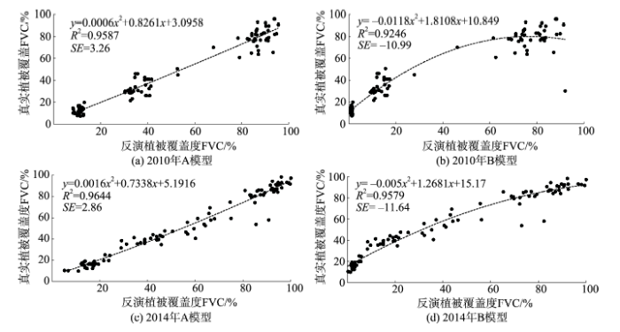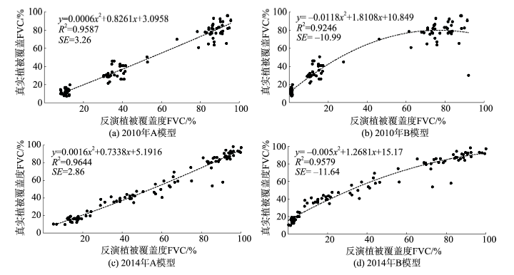 为比较2种模型的可靠性,选择亚像元对比法对研究区2010-05-01的TM影像和2014-09-01的OLI影像进行精度验证。在近期的Google earth高分辨影像(2.15 m)上根据不同植被覆盖度等级选用分层随机抽样法选择100个样点,在每个TM像元点所对应的195个亚像元中,用人工识别的方法直接判读并计算出实际植被覆盖度,并与模型反演的植被覆盖度进行回归分析,获得系统误差(SE)来判断不同模型的可靠性。SE的计算公式为: