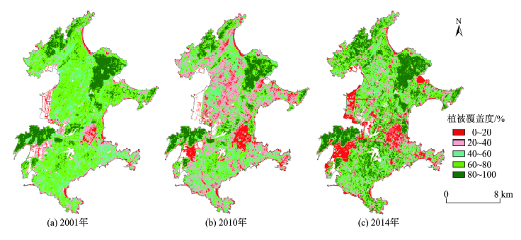 图2显示,研究区植被覆盖度在2001-2014年变化显著,总体上看,低植被覆盖度区域(红色斑块)明显增多,中高植被覆盖度区域(浅绿斑块)大幅度减少,高植被覆盖度区域(深绿斑块)略微增加。表2统计结果表明,3个时相中植被覆盖度达中度以上的区域面积分别占总面积的86.00%、58.92%和71.16%。可见,平潭岛有一半以上区域的植被覆盖度都在中度以上,整体植被覆盖状况良好。研究期内,平潭岛的植被覆盖度变化主要表现在:低植被覆盖度和高植被覆盖度的区域都有所扩大,其中低植被覆盖度区域变化显著,13年间面积增加了65.42%,高植被覆盖度区域面积也增加了34.60%;而中高植被覆盖度区域则出现下降趋势,13年间面积减少了39.48%。