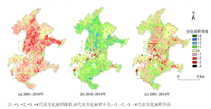 | 变化面积等级 | 2001-2010年 | 2010-2014年 | 2001-2014年 | ||||||