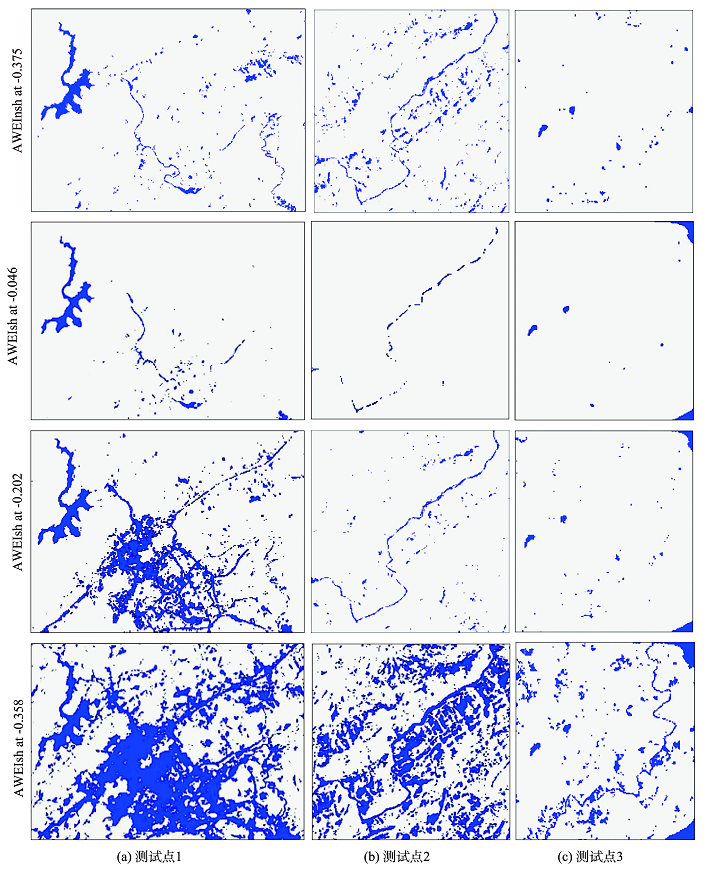 将图3与图2中真实水体相比较,对于AWEI,AWEInsh的最佳阈值分割点为-0.375时,研究区内较大的线状河流的分离效果很好(如测试点1和2),但细小河流信息的分离效果较差(测试点3),并且混入大量阴影及少量的暗色建筑地物;当AWEIsh阈值分割点为-0.046时,面状水体以及山体阴影的分离效果均较好,但河流信息提取效果则较差;当AWEIsh的阈值分割点为-0.202时,虽然能提取到更多的线状河流(测试点1和2),但仍然未能提取到细小河流,且此时低反射的暗色地表与部分河流之间连成一片,分离性较差;当AWEIsh的阈值分割点为-0.358时,细小的河流被提取出来,但大量阴影和建设用地也被提取出来。