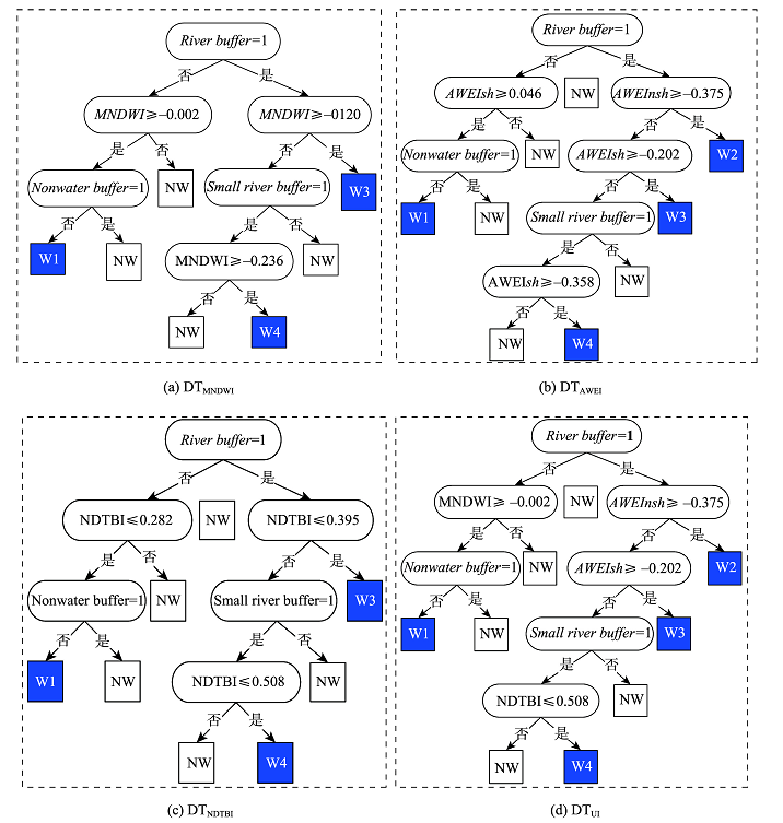 综合3.3节和3.4节,对3个指数的阈值分析、对水体与背景的分离效果分析及对不同水体类型进行分区的基础上,分别应用MNDWI、AWEInsh、NDTBI来构建基于单个指数和分类分区的决策树(如图6 中的DTMNDWI、DTAWEI和DTNDTBI),同时,根据3种指数对不同类型水体的分离效果,按照分类别应用最佳指数最佳阈值进行分层分类的方法,构建综合决策树(如图6中的DTUI)。