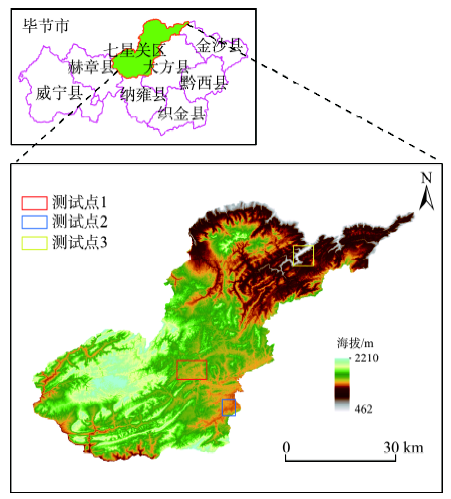 本文选取毕节市七星关区(3421 km2)作为研究区(图1),该区境内山峦重叠,平均海拔1511 m,地貌破碎,土壤类型复杂,河流、湖泊、水库、坑塘等大小水体纵横分布,高原、山地、盆地、谷地、峰丛、槽谷、洼地等交错其间,地表特征复杂,该研究的区域选取具有贵州高原典型性。