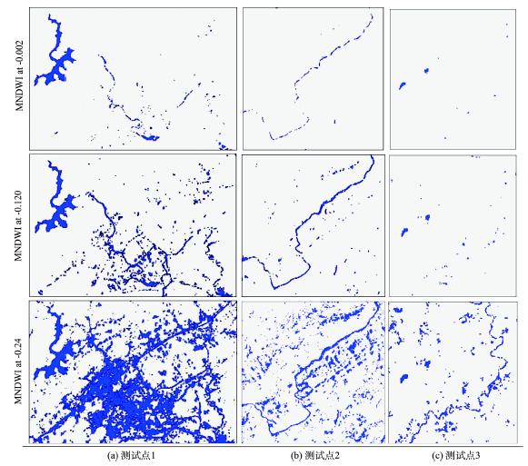 对于MNDWI,在3个阈值分割点-0.002、-0.120和-0.234处分别与AWEIsh3个阈值点-0.046、-0.202和-0.358的分离效果相似。