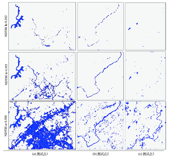 而对于NDTBI,在3个阈值点0.282、0.396和0.508处具有和AWEIsh及MNDWI相近的分离效果,但在对应的阈值处,线状河流区域与多提出的非水体区域的分离性要好于前二者。