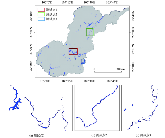 针对研究区的实际情况,选取3种不同环境下的区域作为精度评价的测试区域(图1中的3个测试点),在这3种区域图像上,地表水体受低反射地表、山体阴影及水体底面的沙石等干扰因素的影响。