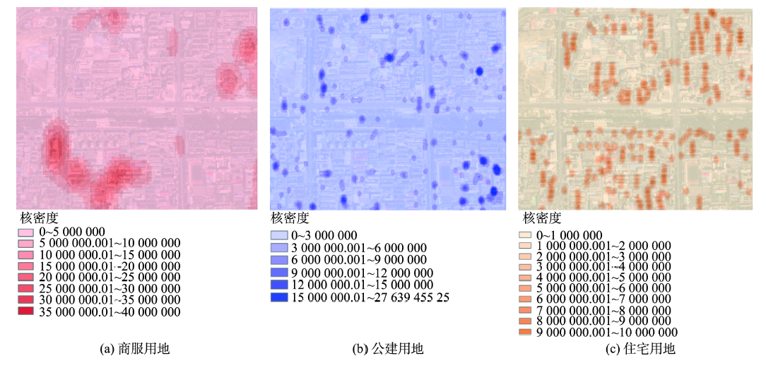 (2)公建用地,又可称为公共管理与公共服务用地,是指用于机关团体、新闻出版、科教文卫、风景名胜、公共设施等的土地。本研究将原始POI数据中的政府机构、火车站地铁站、汽车站、停车场、医疗服务、科研教育、公园广场、风景名胜和公共厕所这9种类型定义为公建用地。