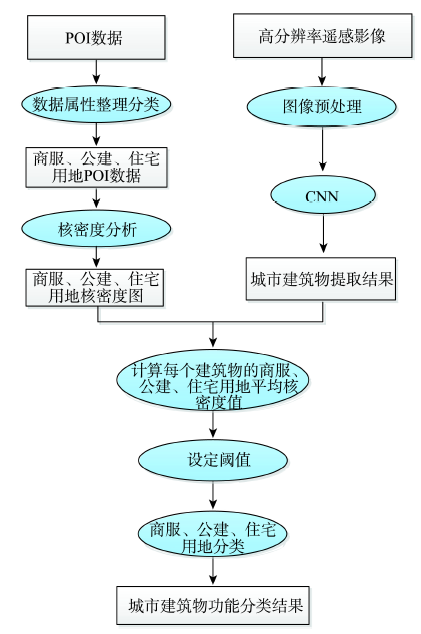 本研究首先对POI数据进行核密度分析,从而获取较为直观的不同功能用地的POI空间分布情况,再对高分辨率遥感影像采用卷积神经网络(Convolutional Neural Networks, CNN)进行城市建筑物的提取。在此基础上,统计每个建筑物每种用地的平均核密度值,并以此作为其属性值,通过对属性值设置阈值,完成城市建筑物功能分类。技术路线如图3所示。