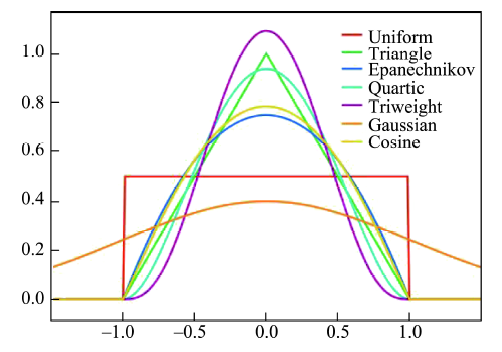 式中:K为核函数(非负,积分为1,符合概率密度性质,并且均值为0),h>0为一个平滑参数,称作带宽(bandwidth)或窗口。各种核函数(如uniform、triangular、biweight、triweight、normal、Epanechnikov)的图形如图4所示。