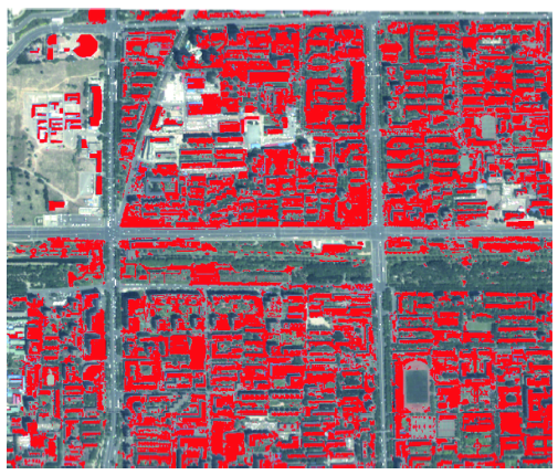 根据QuickBird影像实验区,选择典型的、像元纯度较高的样本80个,建立建筑物样本库。对实验区的样本库使用CNN方法进行训练学习,经反复实验以及相关分类参数的多次调整。发现使用活化函数为对数函数,训练贡献阈值为0.7,训练速度为0.2,隐藏层数为2,训练迭代次数为1000次时建立的模型进行提取,实验能够得到具有最高分类精度的结果。利用该模型,将实验区的建筑物信息识别提出,再剔除其中面积过小的图斑,得到建筑物提取结果(图7)。将提取结果与目视解译结果对比,其精度高达93%。