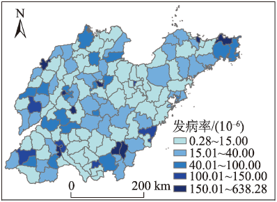 山东省位于中国东部沿海,西邻华北平原,东部为山东半岛并伸入黄海。山东省总面积15.8万km2,以近9800万人口成为中国的第二大人口大省。山东属温带大陆性季风气候,雨热同季,年均温度13 ℃,降雨集中于夏季,全年降雨量在550~950 mm之间[6]。山东省是手足口病的多发省份,自2000年起烟台、泰安、临沂等地均有暴发流行报告,2008年山东省全省手足口病发病数居全国第三[25]。图1展示了研究区域山东省及其发病率分布图。