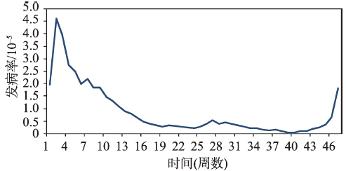 从全年趋势上看,手足口病发病率在2008年5-6月时最高,全省每周发病率维持2×10-5以上, 7月过后逐渐下降,在冬季约11月有轻微的上涨趋势,但发病率仅在1×10-5左右,随后一直平稳直至2009年春季。与过往的相关研究结果类似[35],山东省手足口病的高发季节为夏季,且在冬季11月出现一个次高峰(图3)。
