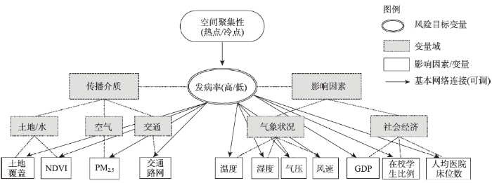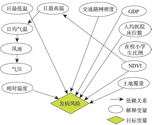 (1)确定变量及变量域。根据领域知识我们列出了手足口病的传播介质及相关的影响因素(图2),传播介质包括:土地/水等,其代理变量包括所提取的土地覆盖百分比、NDVI;空气,提取了PM2.5的估算结果作为空气污染的代理变量;交通,通过交通路网展示交通密集程度。影响因素包括气象及社会经济,气象则包括温度、湿度、气压、风速,社会经济包括GDP、在校学生比例及人均医院床位数。如果数据允许,将采用更多的变量。