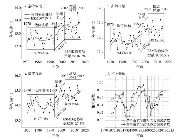 通过ESMD方法,滤除气温序列年际波动变化后,秦岭南北气温变化具有同步性,呈现出典型的“非线性、非平稳、阶梯状”的增温过程(图2)。具体变化过程可分为三个阶段:① 1970-1993年为第一阶梯,以1984年为转折点,前期波动下降,后期小幅波动上升,整体呈现低位平稳波动;② 1994-2002年为第一阶梯与第二阶梯的过渡时段,气温呈现快速上升;③ 2003-2015年为第二阶梯,气温维持高位波动,且在2005-2012年呈现6年波动下降,增幅速率有所减缓,与全球变暖“停滞”趋势相符合。从长期趋势变化对气温变化贡献率看,ESMD趋势项在秦岭南北气温变化贡献率整体不高,三个分区贡献率分别为:汉江谷地(27.5%)< 秦岭南坡(30.5%)< 秦岭以北(36.5%),说明秦岭南北气温变化以年际波动为主导,并未呈现明显的线性增暖趋势。